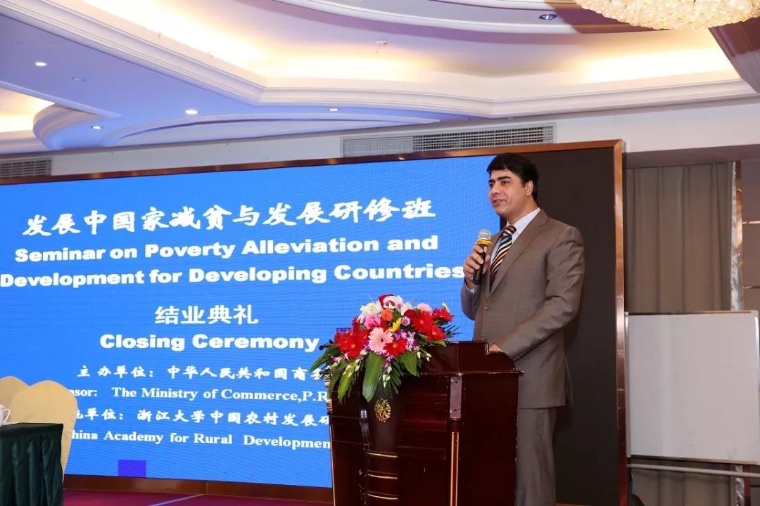 结业典礼上,浙大卡特国际院长陈志钢教授代表承办方对研修班做了工作总结。陈志钢教授向研修学员顺利结业致以热烈的祝贺,希望各位学员将这21天的所学带回各自国家,并对其未来发展建树功绩。来自巴基斯坦的汗·穆罕默德·沙菲克( KHANMUHAMMAD SHAFIQUE) 代表全体学员做了学习总结发言。他表示衷心地感谢中国政府提供的研修机会,并介绍了通过研修班的学习、交流与实地考察,使发展中国家学员对中国改革开放所取得成就有了全新的认识;非常感谢中国政府以及浙江大学,让发展中国家的官员能相聚在杭州,共同学习中国和浙江的减贫经验;特别感谢中国政府在对外援助上做的突出贡献。他们回到各自的国家后,将把中国的减贫经验结合到本国的实践中去,为消除发展中国家的贫困做贡献。同时他还高度评价了授课专家教授的学识渊博及浙大卡特对研修班的周到安排和热情接待。