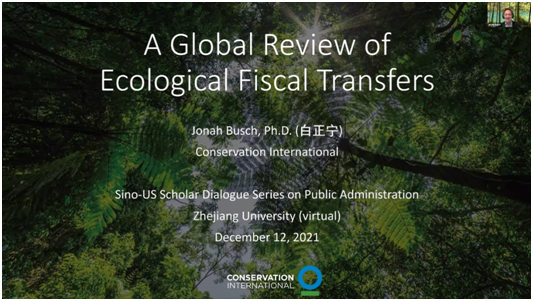 在A Global Review of Ecological Fiscal Transfer的主题讨论中,Jonah Busch博士介绍,生态财政转移是根据生态指标在政府间的公共财政转移支付。它可以补偿地方政府生态保护的成本,且可以激励更大程度的生态保护。他回顾了几个已建立生态财政转移的国家,包含巴西、葡萄牙、法国、中国和印度,以及另外10个正在兴起生态财政转移的国家,并介绍了生态财政转移机制在这些国家的产生、设计以及效果。此外,Jonah Busch博士为大家展示了将生态财政转移扩展到其他国家的可能性,并提出在各国作出气候承诺的背景下,这一举措是及时且必要的。