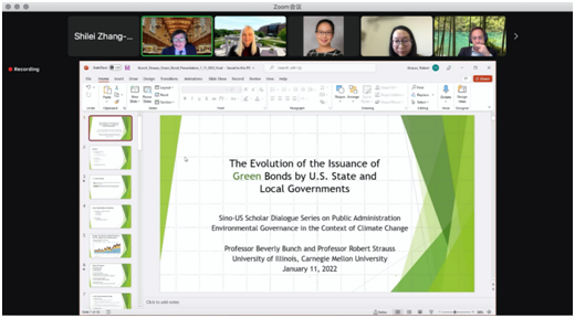 在Green Bonds as an Option for Illinois State and Local Governments的主题讨论中,Beverly Bunch教授介绍,债券是政府或企业为了筹集资金向债权人承诺还本付息的有价证券,而绿色债券和其它债券的不同之处在于,它的收益是用来资助那些对环境有积极影响的项目。她展示了在过去五年间欧洲、亚太地区、美国等地的绿色债券发行情况。绿色债券被用于可再生能源、绿色建筑、交通节能、适应气候变化、可持续土地利用和生物多样性保护。之后Robert P. Strauss教授从政策组织结构、地理划分、历史沿革等方面介绍了美国绿色债券的发行原因和发行情况。随后,两位学者介绍基于在美国开展的实地调研的情况,并提出了该领域后续值得研究的一系列问题。为了方便大家对这一议题的深入了解,两位学者将自己的展示材料在个人主页上发布,也欢迎感兴趣的老师同学们前去阅读。