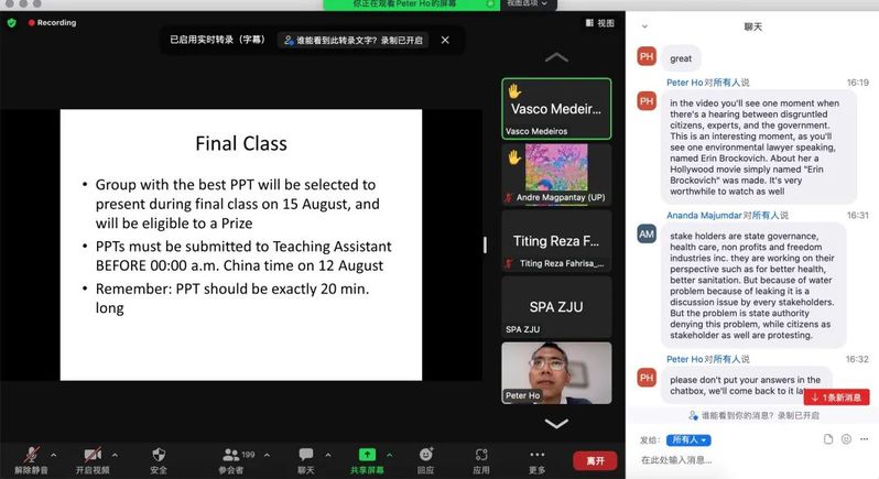 8月1日-8月3日,公共管理学院土地管理系Peter Ho教授带来了主题为自然资源、土地和可持续发展(Natural Resources, Land, and Sustainability)课程,开启了本模块课程与全球学生的线上见面。Peter Ho为大家介绍了可持续发展的思想源流和发展,并从政治、治理、技术等多个角度介绍其定义。课程中,Peter带领同学们梳理了当前世界面临的气候变暖、核污染、基因漂移等众多挑战,启发大家思考可以尝试的积极行动,并通过案例指出在可持续治理过程中不同的参与主体及其应当承担的责任。慕尼黑工业大学的Walter Timo de Vries教授作为特邀嘉宾,带领学生们从脆弱性、生命力、多功能性的角度科学分析区域发展可持续性。在课程中,Peter Ho用丰富的案例、前沿的理论、积极的互动和新颖的呈现、解读,为同学们带来了耳目一新的体验。