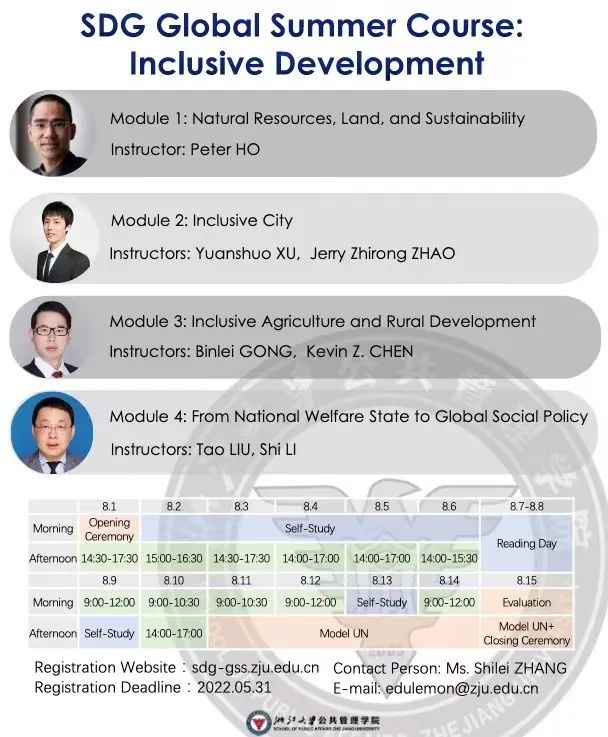 包容性发展课程由土地管理系教授Peter Ho、社会保障与风险管理系教授刘涛、农业经济与管理系长聘副教授龚斌磊、城市发展与管理系百人计划研究员徐元朔主导,邀请校内外知名学者共同授课。2022年课程共录取学生318名,其中浙江大学校内152人(本科生133人,研究生19人),海外高校学生136人,港澳台高校16人,国内C9高校7人,国内其他高校7人。公共管理学院希望通过15天的学术课程和研讨展示,能够加深学员对全球化背景下可持续发展内涵及实现路径的认知,了解全球最新理念与行动,拓宽自身国际化视野。